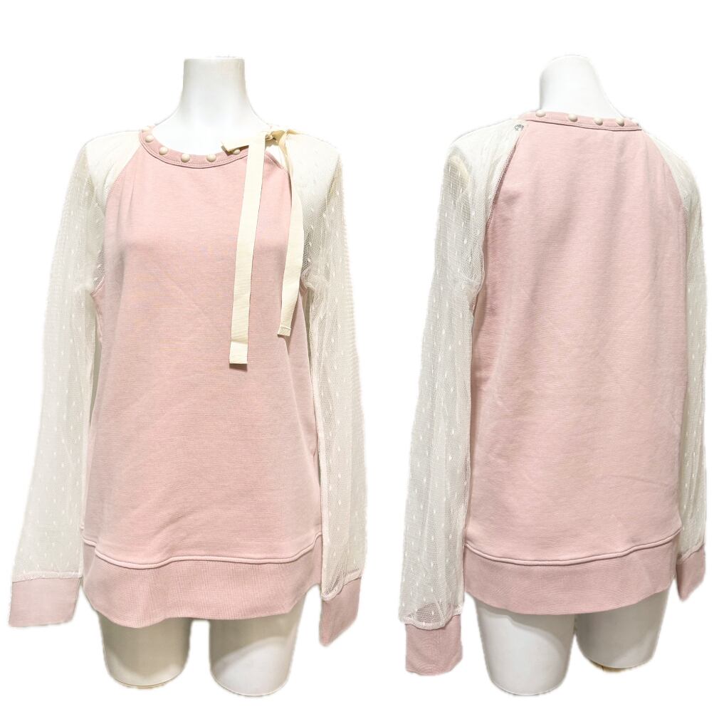 上品で可憐な世界観を愛する女性から高い支持を集めるRED VALENTINO(レッド ヴァレンティノ)の、チュールスリーブが美しいフェミニントップス。柔らかなピンクのボディに、ドット柄チュールの透け感が軽やかに映えるデザイン。襟元には装飾とリボンモチーフをプラスし、RED VALENTINOらしいロマンティックなディテールが詰まった一枚です。