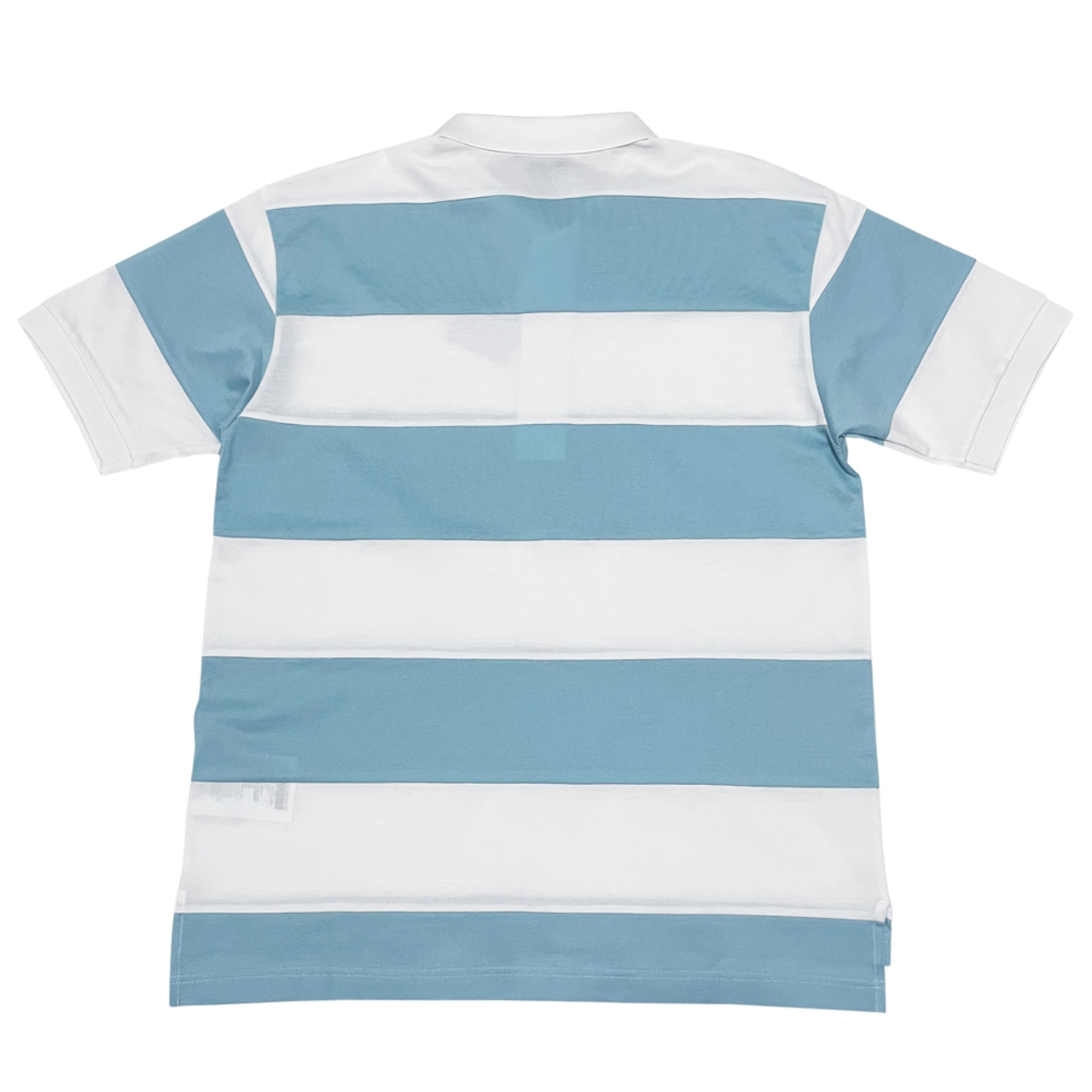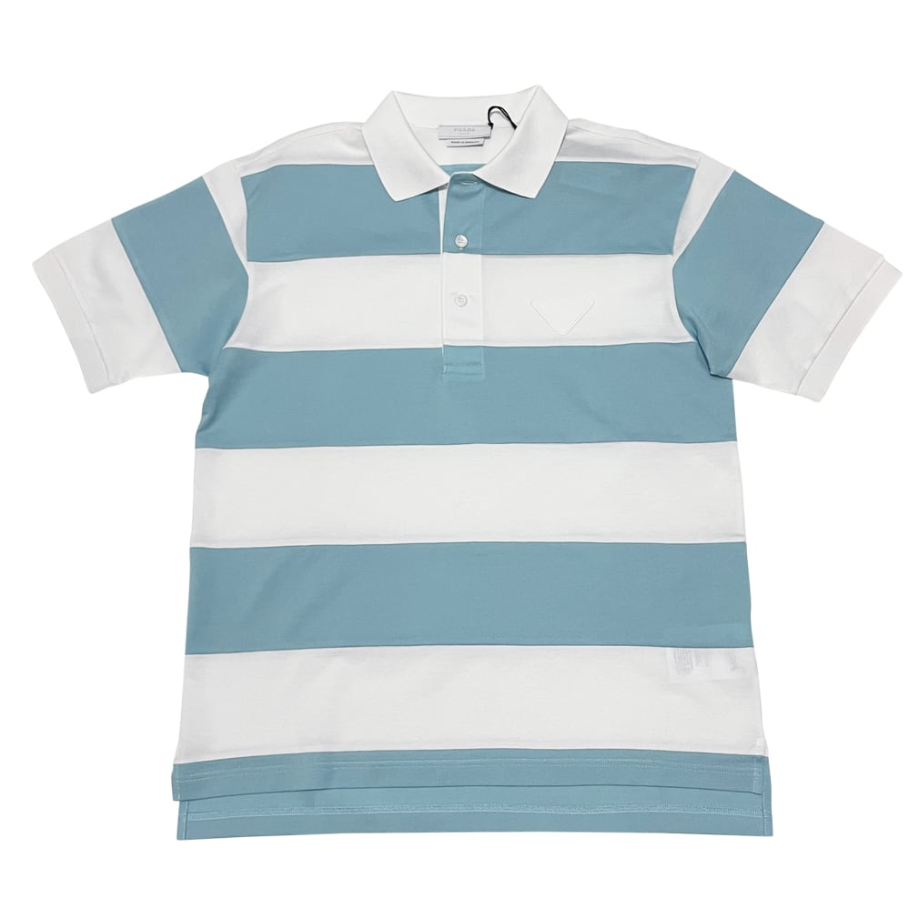 若々しい印象の綺麗色太めボーダー柄のプラダのメンズポロシャツ。普段にゴルフウェアにとバリエーションに加えてみてはいかが?