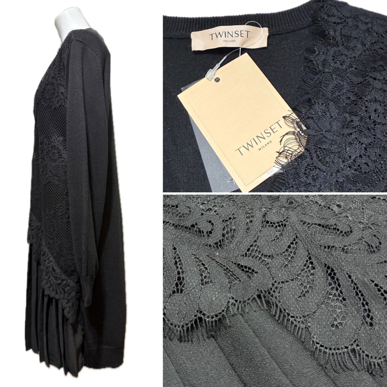 新品ツインセットTWIN-SETレース×プリーツ切替ニットワンピース黒XS