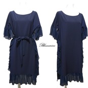 両サイドのシフォンフリルが女性らしく上品なブルマリンのワンピース。締め付けがなく着心地が楽なのにフォーマルな場の装いにピッタリのお助けワンピースです。