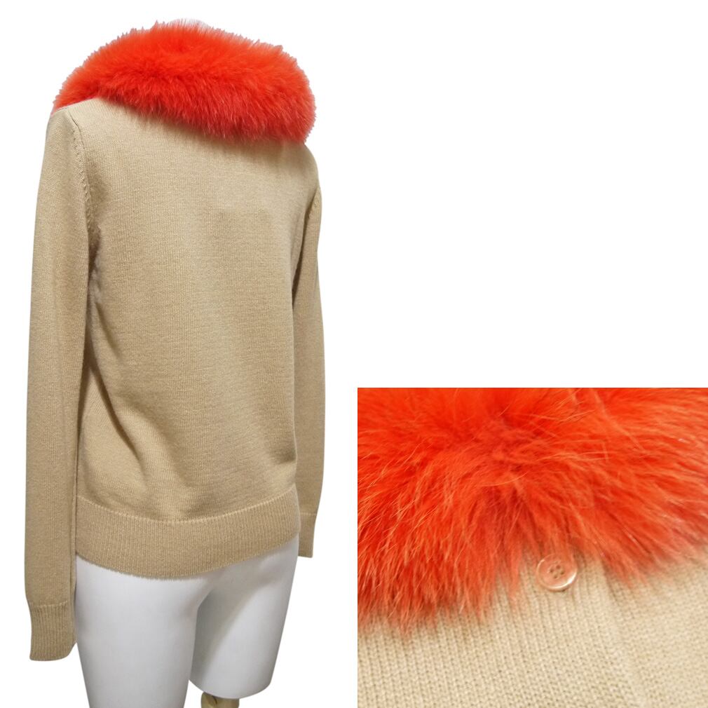 鮮やかなオレンジのふわふわでボリュームのあるフォックスファーがゴージャスで素敵なブルーガールのカーディガン。エレガントはもちろん、カジュアルスタイルにも合わせるとカッコ良いと思います。